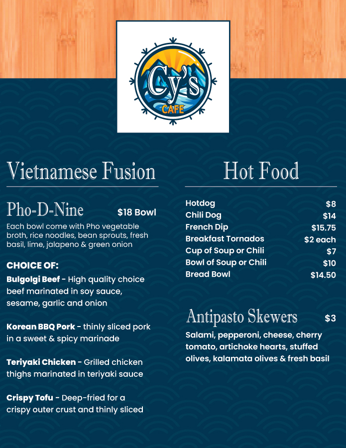 Located on the main floor of the lodge. Start your day off right with a great breakfast or snack and come back for an awesome lunch! Quick snacks and Grab & Go items are available all day.